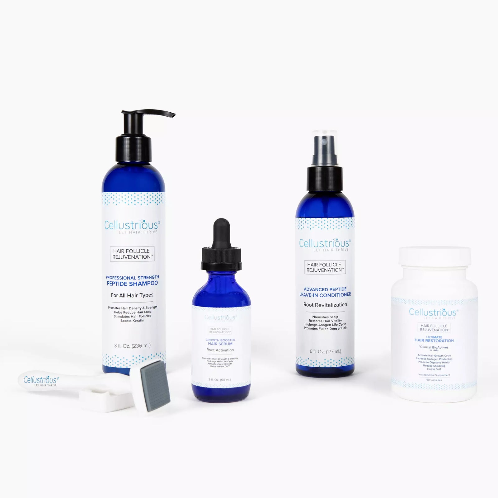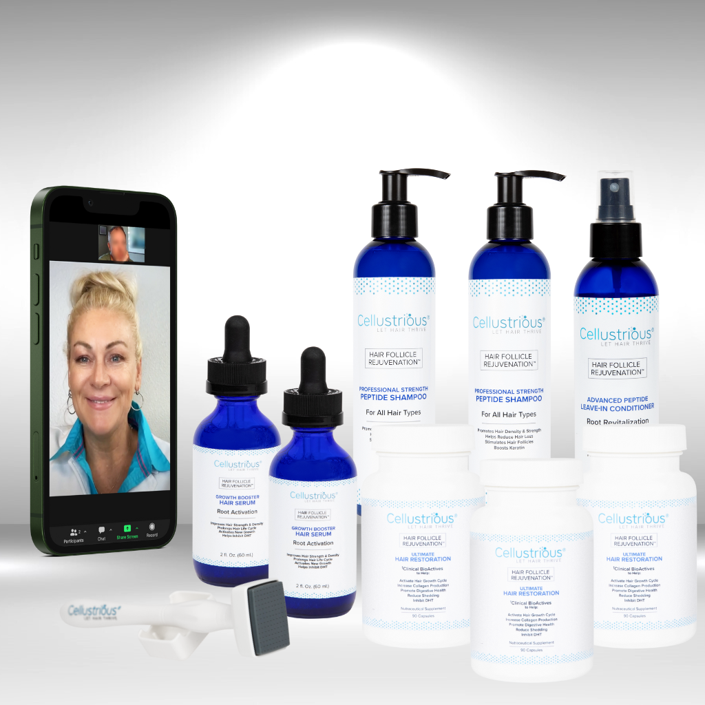 The Cellustrious® professional treatment conatins 9 of the most powerful plant-based peptides and growth factors (ingredients backed by clinically-trials) known to support scalp health via wound-healing, inhibit DHT, and promote hair growth.